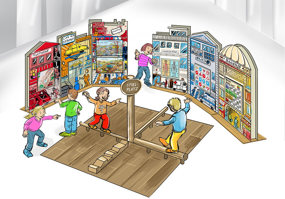 Entwurfs-Skizze für Wandspiele in einem Einkaufszentrum